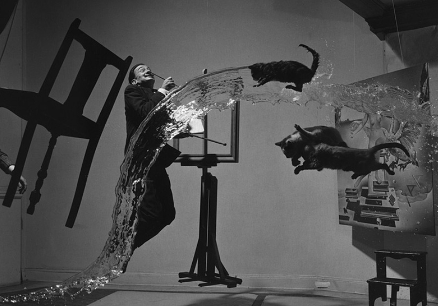 Halsman constructed the setting by suspending the furniture and other elements with thin wires. Then, he had his assistants throw the cats and the water while Dali jumped.