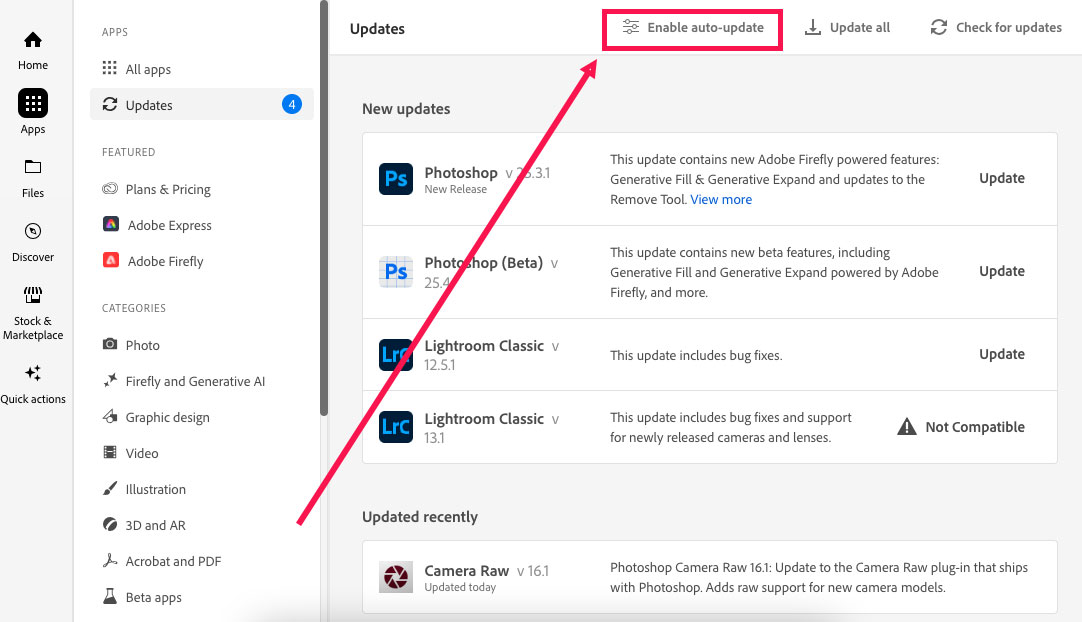 Head to the Creative Cloud Apps window and select “Enable auto-update”.