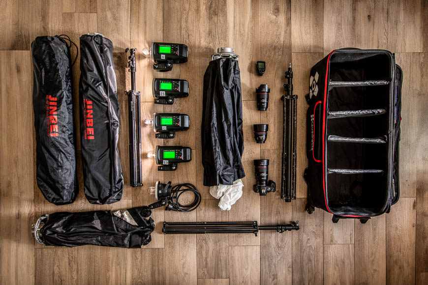 I went with the Chinese Jinbei brand as I liked their quick-to-open umbrella-type softboxes – quick to set up and tear down. For my rim lights, I use two 180x40cm Stripboxes and 90x60cm Softbox for uplighting