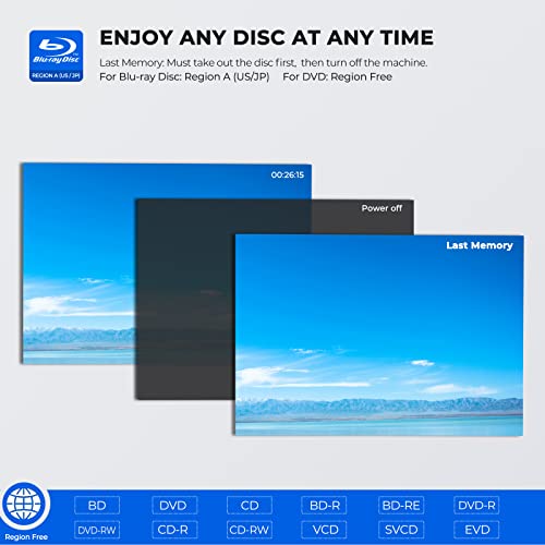 【13.3″ Portable Blu Ray DVD Player】Support full HD video playback (For Blu-ray disc: A Region; For DVD: Region Free). Last memory function let you always restart from where you left. (Attention: Take out the disc first, then turn off the machine)